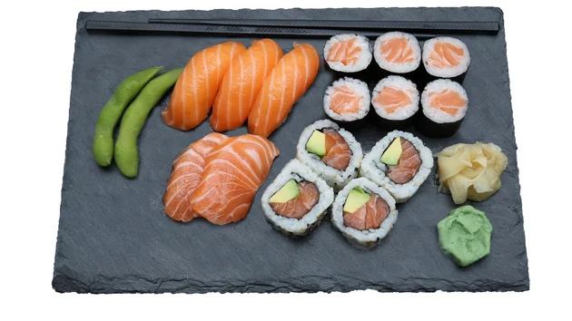 8 pcs salmon avocado roll, 6 pcs salmon maki, 6…