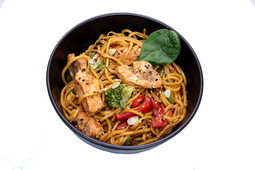 Cooked noodles and mixed vegetables sprinkled with spring onion and sesame seeds